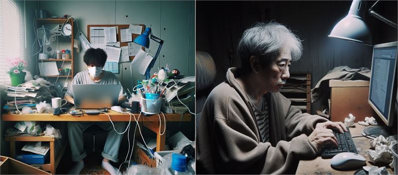청년 히키코모리는 이제 중년이 되었다. 사회에 나오지 않는 청년은 경제작 사회적 문화적 개인적 문제를 일으킨다. 그 비용 후과는 개인과 사회가 나누어진다. 사진은 인공지능이 그린 포토형 자료.