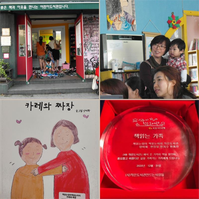 왼쪽 상단부터 시계방향으로. 1. 행당동 시절의 책읽는엄마 책읽는아이. 2. 2011년 두 살 때. 희수가 책엄책아의 사서이자 활동가 이소유 쌤의 품에 안겨있다. 3. 2021년, 희수네 가족은 책읽는 가족상을 받았다. 4. 희수 엄마 양미화 님도 책엄책아에서 그림책 수업을 듣고 책을 썼다.